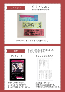 ノベルティはジャンルごとにクリアしおりがつきます。(本に挟んでお渡し予定)